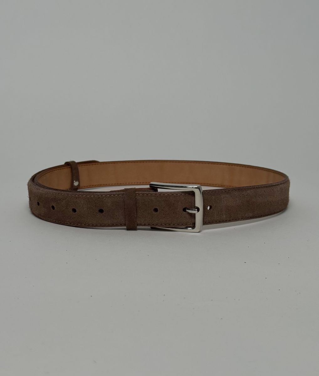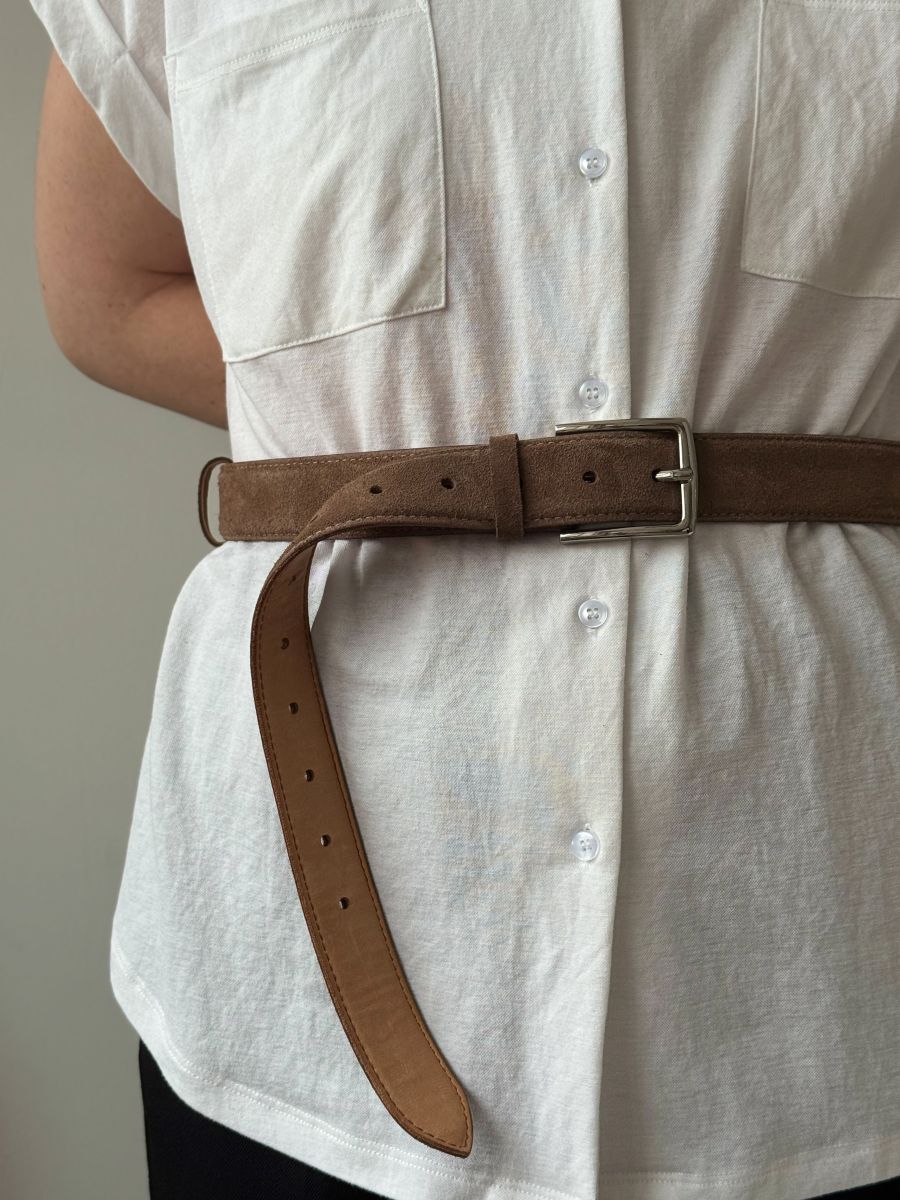 Верх ремня выполнен из качественной натуральной замши, изнанка - натуральная кожа. Ширина ремня 3,5 см. Ремень имеет удобную пряжку с фиксатором, обеспечивающую надежное крепление и комфортную посадку даже после длительного ношения.